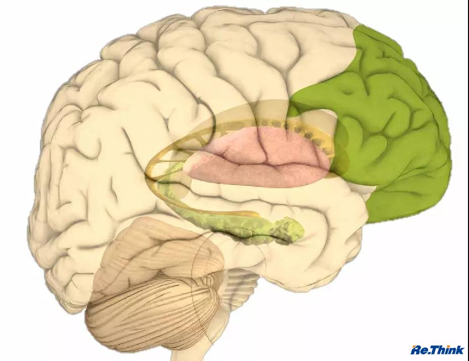 女性在情緒上更不容易沖動(dòng),青春期時(shí),女生比男生早熟1~2年。因為女性前額葉皮層比男性大(下圖右邊綠色部分)。